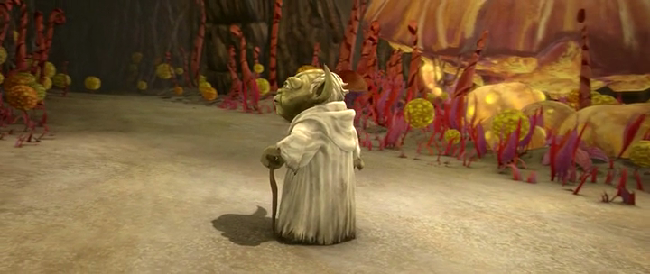 Yoda's journey ultimately gives him insight into the future - or a future - as well as a degree of omniscience. Not content to merely face his own dark side, he also comes to terms with his own optimism - Star Trek fans will recognize the idyllic hallucination of Dooku, Obi-Wan, and Qui-Gon on Coruscant as being similar to Kirk and Picard's brief jaunt into the Nexus of Star Trek: Generations although it's a little less hammy here. Yoda's rejection of the lie allows him to see through the cloak of the Sith in between the sumptuous visuals before ultimately revealing what's behind the masks of the priestesses.