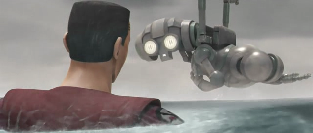 Kamino's dull grey hallways are once again the center of attention, with the added benefit of having few or no new character designs thrown in to keep it interesting. AZ-3 returns, sounding like a more competent and oblivious WAC-47, showing us that the animators may be frustrated toy designers - the little guy has a hover mode!