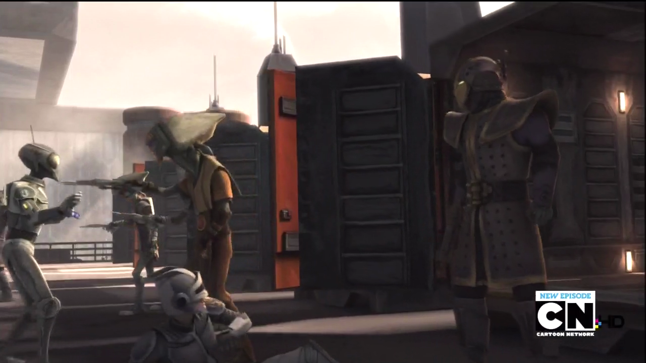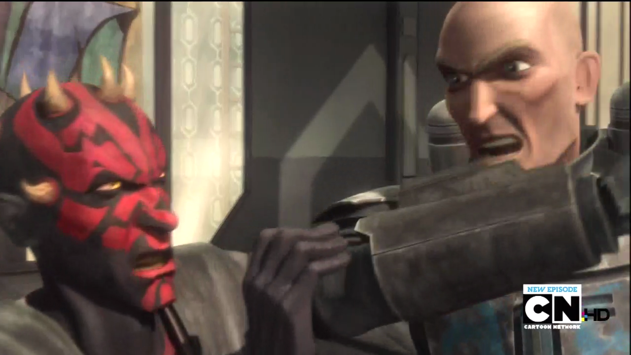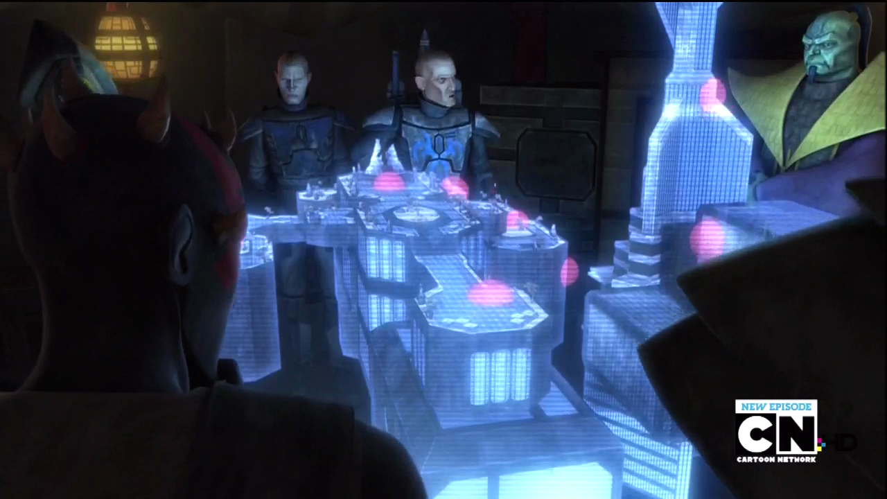 While "Eminence" put all the players on the board, "Shades of Reason" puts forth a big planetary takeover plot with the vast majority of the galaxy's organized criminals (sans signs of the Hutts) visiting Mandalore. In it, the Black Sun and some other thugs invade Mandalore's loading docks and apparently this is enough to topple the government. Just watch it before you read, though, because it truly was exciting.
