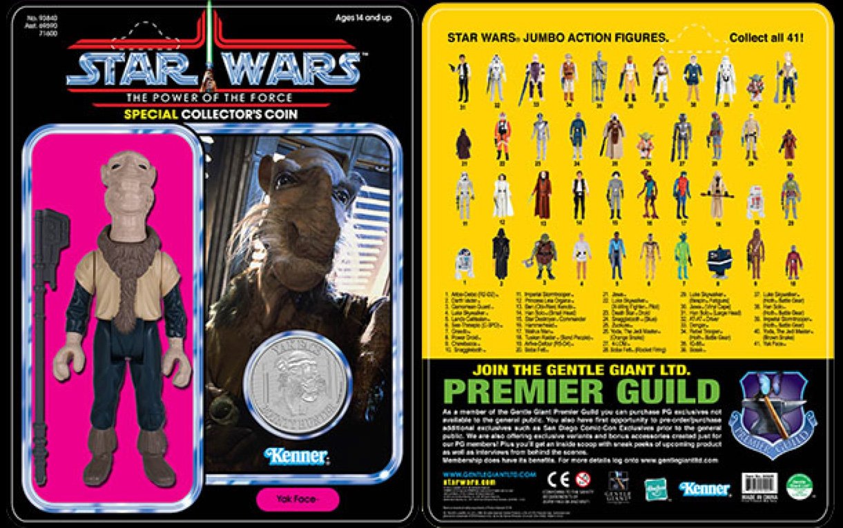 Surprise? There is another...Gentle Giant SDCC exclusive. Today's announcement is plenty times awesome, especially for those who are versed in their vintage Kenner history and know that this was only released in Canada and Australia in this packaging format and a Tri-logo card in Europe, but never released in the U.S. (sound familiar 2013 Movie Heroes fans?) The fourth SDCC exclusive is a Jumbo Vintage POTF Yakface complete with coin!