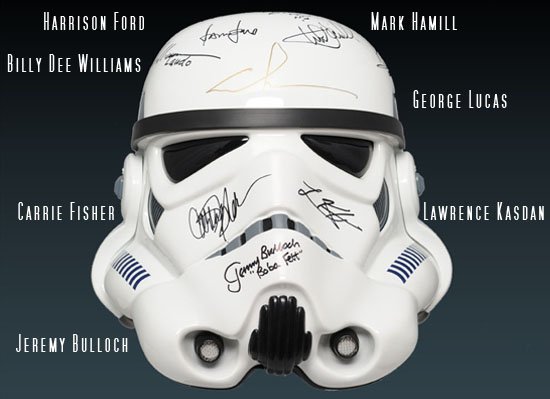 eFX Collectibles and the 501st TK Project is auctioning off a replica Stormtrooper helmet to benefit the Make-A-Wish Foundation. This special and unique edition helmet features more than a dozen signatures from the cast and crew of the original Star Wars trilogy, including Mark Hamill, Harrison Ford, Carrie Fisher, and George Lucas himself.