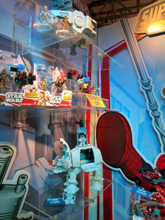 So Playskool. It's one of the niftiest ongoing formats that most collectors ignore. Complete sets of the original Galactic Heroes are far and few between, but the new articulated format (which started under the Jedi Force banner) may be gettable. One of the biggest new items was a BB-8 Action Base, which unfolds to reveal numerous compartments and gadgets - including more inside the big droid head. I was told it included 2 figures, but 3 were on display.New figure packs, Marvel, and Transformers Rescue Bots were also shown. Neat stuff, you'll dig it. If you don't, perhaps your kids will.