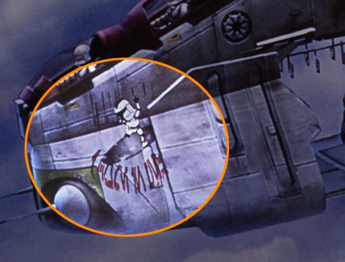 Thanks to an observant Facebook reader, we spotted a little Easter egg in the backround art featuring a Clone Trooper bronco busting on a rocket. Perhaps as an ingenius nod to the Slim Pickens role in Dr. Strangelove?