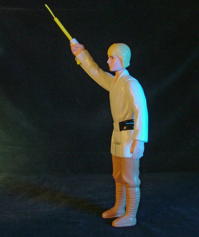 Digitally scanned from mint 3 ¾” Kenner originals and reproduced to a substantial 12” tall. Nothing has been overlooked. Roto and Injection molded and made of durable plastics, this jumbo figure is fully articulated and includes a faithfully reproduced yellow Light Saber that extends just like the original.