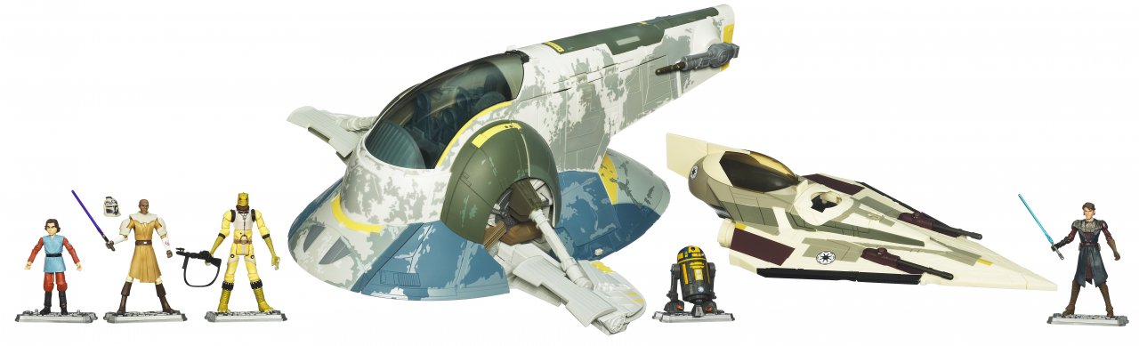 Create an all-out battle on the ground with these five detailed figures and then take the battle to the skies with the two starships! Pit your heroic MACE WINDU™, ANAKIN SKYWALKER™, and R8-B7 figures up against the villainous power of your BOBA FETT™ and BOSSK™ figures. When the action is too much to contain, take off in BOBA FETT’S SLAVE I™ starship. Featuring a pivoting cockpit and wings, bomb-dropping action, firing cannons that turn 360 degrees and a detention cell to hold figures, this vehicle is definitely a menace in the skies. Fit your MACE WINDU figure into his JEDI STARFIGHTER™ vehicle’s opening cockpit and blast off after the bounty hunter villain. The JEDI STARFIGHER vehicle separates into two vehicles with a droid socket for your DROID figure to sit and a firing projectile launcher on the scout fighter vehicle. The two vehicles and five fearsome fighters are well-matched — but only you can decide who’ll win the battle!