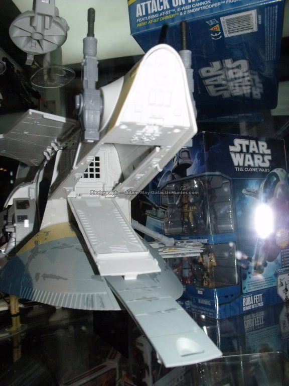 For $99.99 at (sadly) Toys'R'Us we can buy the all-new Slave 1 from The Clone Wars and FIVE figures plus Mace Windu's Jedi Starfighter, which, if sales go well, could (well, it's likely to) lead to an Empire Strikes Back version of Slave 1 (the rumor-mill has this already set as an exclusive to Target stores — we're awaiting confirmation) and an Attack of the Clones (a/k/a Jango Fett Slave 1). We could also see a pretty general-purpose Mandalorian Interceptor, too! Does Boba Fett (circa The Empire Strikes Back) need an escape pod? What is it for? We'll find out (eventually). In the meantime, YOWZA, doesn't this set pack a lot into it?