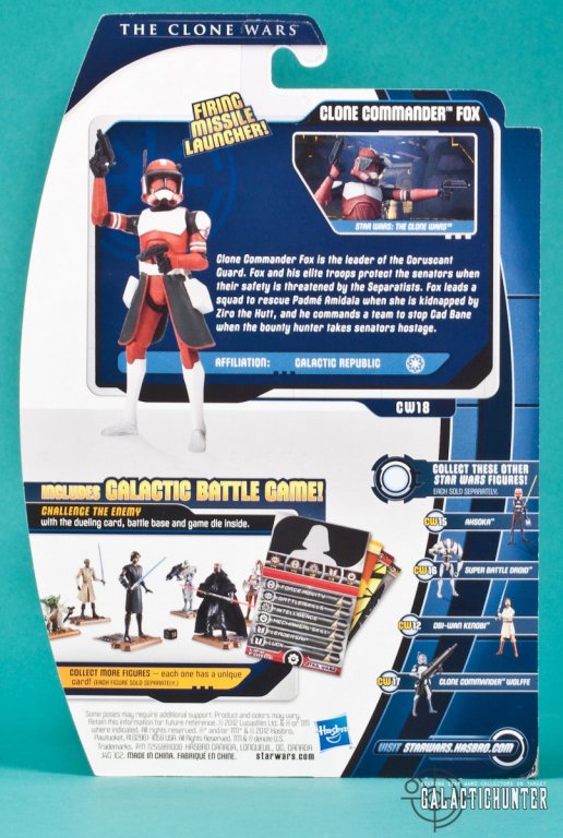 Components for the Galactic Battle Game are packed in with each 2012 Clone Wars figure that include a tan Star Wars action figure stand with an insertion for the character card on the back. There are also two notches on the rear of the stand to reveal and generate a "power boost". The character card and six sided game die feature all the icons for the character's "life force" or hit points. Commander Fox is particularly strong with Battle Skills (12 points), Leadership (11 points), and Inventory Control. I kid on the last one, of course.