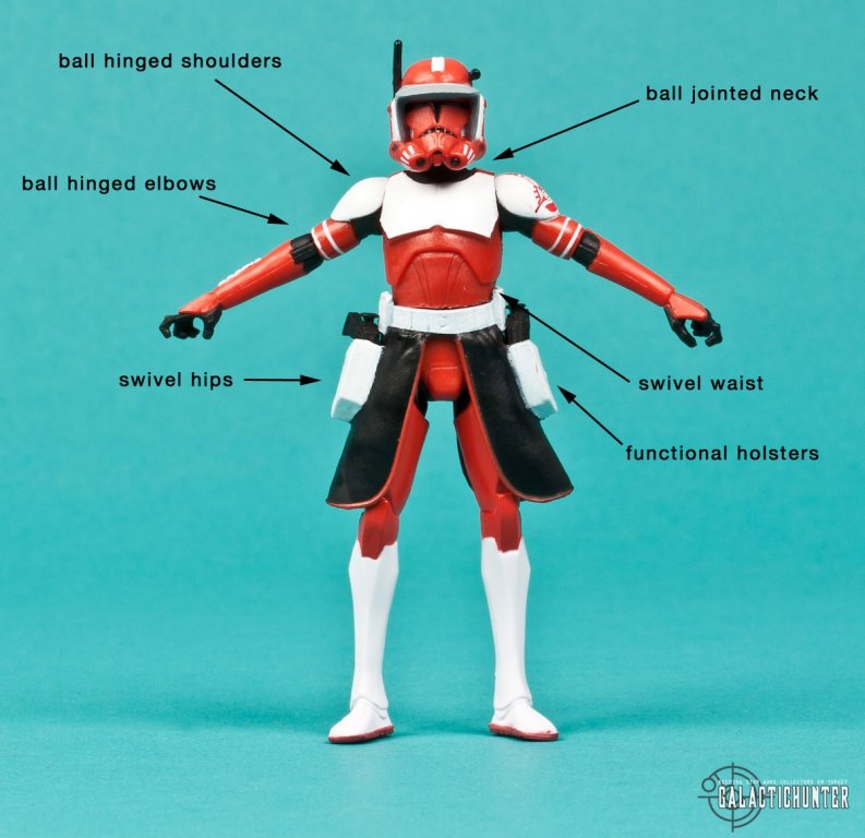 ARTICULATION: Is less more? With only 8 points of articulation, not really. For Clone Troopers, especially one as stunningly designed as Fox, you demand some lower leg articulation. Even adding ball hinged knees would've have improved this figure exponentially. You could achieve different looks with ball hinged arms and a ball jointed neck that may be enough for some, and if Hasbro's market research is accurate, that "some" would mostly include kids. As it stands, and with no pun intended, Commander Fox can only be positioned upright with legs straight. That just doesn't cut it in 2012 for this collector, especially for 9-10 bucks of plastic.