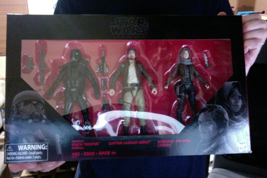 Target's Rogue One: A Star Wars Story Hasbro exclusive sets are in stores as of today. A 12-inch 6-pack, a 3 3/4-inch 7-pack, and a 6-inch 3-pack are there now. The Black Series set includes a repack of Jyn Erso along with a plussed up Imperial Death Trooper with more gear and the jacketed version of Cassian Andor. The Eadu head looks a smidgen better - but they're out there now if you need them.