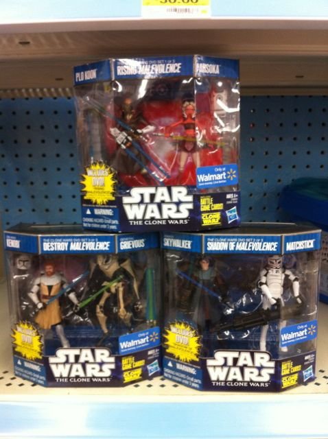 The Walmart exclusive Malevolence DVD 2 Packs have been spotted at a store in San Diego for $15.97 each. Each set comes with a DVD containing an episode from The Clone Wars Malevolence story arc. Other than this, the figures have been re-issued from previously released blister cards.