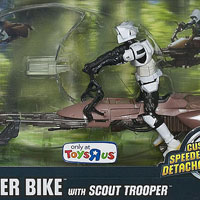 The new ToysRUs exclusive Speeder Bike with Scout Trooper is now IN STOCK at ToysRUs.com for $21.99 each. This flew (no pun) out of stores on its first pass and you can score one, two, or more now with this week's Buy One Get One 50% Off deal.