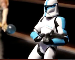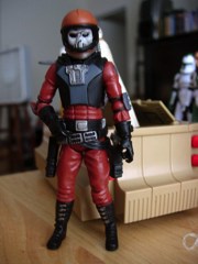 So, Clone Commander Jet. I know what you want to read is commentary on Toy Fair, but, as a member of the toy industry, I'm in meetings and trying to figure out how to cram a pile of paperwork into a carry-on bag with my dirty socks. I'll try to write something on the plane or as soon as I can get sme decent time to collect my notes. This trooper was delayed, and features a unique accessory.