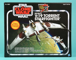 It's all in the packaging and when it comes to the classic Kenner black and silver, Hasbro knows they have gold amongst nostalgic collectors. Presenting some boxed photos of the new The Vintage Collection Class II Vehicles featuring Obi-Wan Kenobi's Jedi Starfighter, the AT-AP, and V-19 Torrent Starfighter. These retail for $31.99 and are currently being spotted at ToysRUs.
