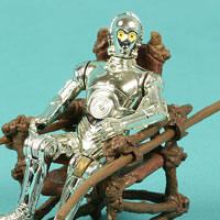 SL17 C-3PO is a repack of The Saga Collection release from 2006 featuring the golden deity on his Ewok throne. The vac metal is quite striking and perhaps too clean on this figure, but the overall result is good and true to that particular scene from Return of the Jedi. Would an Ewok fire spit Han and Luke be too much too ask from Hasbro? Probably.