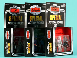 The Vintage Kenner Star Wars 3-Packs are some of the most rare and difficult action toy collectibles to track down, let alone compile a complete set. To commemorate Empire's 30th anniversary, Hasbro teams up with Target to produce 3 packs within a 3 pack and reproduces the classic Kenner packaging that sends wings aflutter for many who love the nostalgia and design of the black and silver piping as well as that Kenner logo.