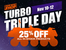 For 3 days only beginning today, StarWarsShop is offering 25% off all their IN STOCK items! Discount is applied at check out and sale ends 11:59 pm PST on Friday, November 12th. Click here to shop!