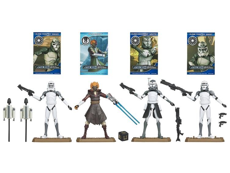 This Ultimate Gift Set has everything you need for a truly spectacular battle between the 104th Battalion "Wolf Pack" and the "intergalactic" forces of evil! Your CLONE COMMANDER Wolffe, PLO KOON, CLONE TROOPER Sinker and CLONE TROOPER Boost figures are heavily armed and ready for payback for their fallen comrades! Two of the figures are armed with awesome blasters that launch projectiles. This set also includes Galactic Battle Game cards, bases and die!