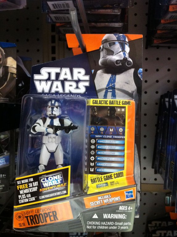 Sony teams up with Hasbro to promote their Clone Wars Adventures online game. Basic The Clone Wars and Saga Legends action figure blisters are being affixed with stickers touting a 30 day trial membership and 450 Station Cash. These stickers are showing up at Toys R Us stores this week.