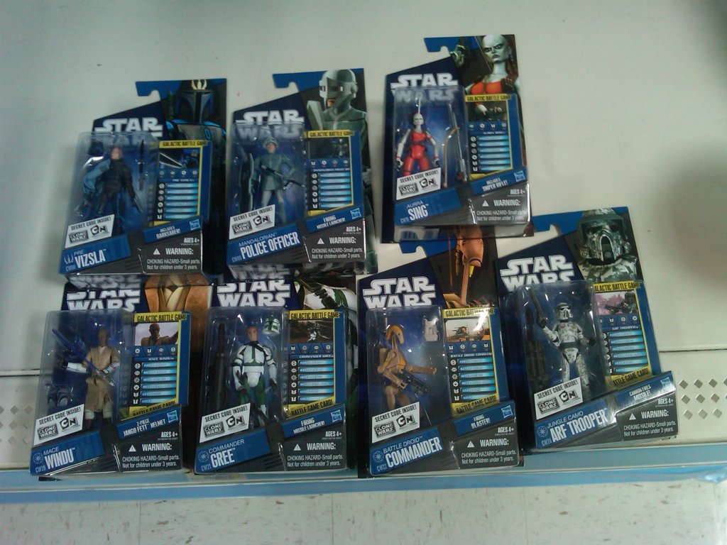 The latest wave of new blue card Clone Wars action figures have been found by Mickey Gunslinger at a Walmart in Albuquerque (we guess Mickey must have taken that left turn!) The new figures include CW20 Mace Windu with battle damage Jango helmet, CW22 Battle Droid Commander, and CW24 Jungle Camo ARF Trooper.