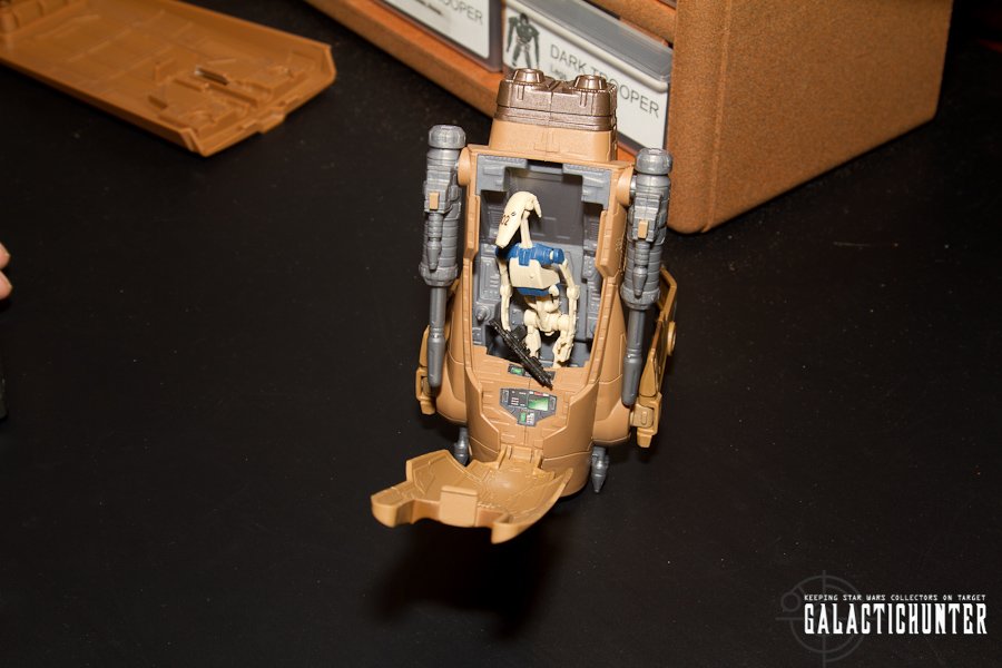 The vehicle itself should be familiar to some of you in that it feels a little like Kenner's AST-5. (Look it up, kids.) The figure pilots the ship by laying on its back, and there are rotating wings and rotating firing cannons. It slips into a storage bin in the top of the MTT vehicle, and has decent deco. Note the red eyes on the ship, making it ore than a little like a Battle Droid heads with wings on it. It's a lot of fun, too.