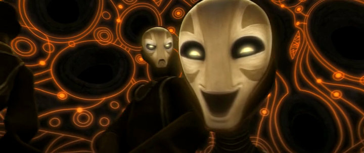 Yoda's journey ultimately gives him insight into the future - or a future - as well as a degree of omniscience. Not content to merely face his own dark side, he also comes to terms with his own optimism - Star Trek fans will recognize the idyllic hallucination of Dooku, Obi-Wan, and Qui-Gon on Coruscant as being similar to Kirk and Picard's brief jaunt into the Nexus of Star Trek: Generations although it's a little less hammy here. Yoda's rejection of the lie allows him to see through the cloak of the Sith in between the sumptuous visuals before ultimately revealing what's behind the masks of the priestesses.