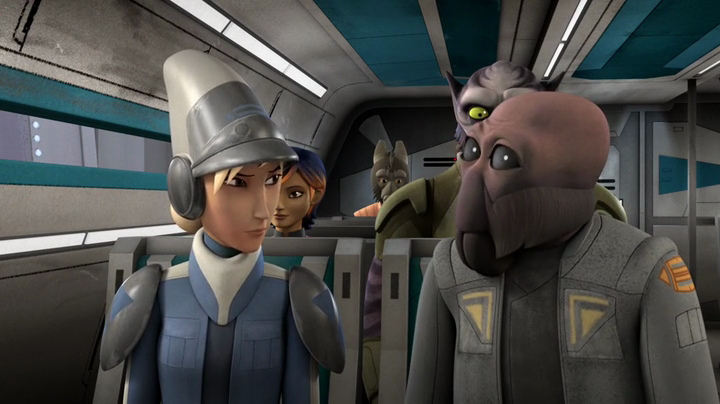 The story is fun and familiar - R2-D2 and C-3PO show up with some Imperials looking to make a gun delivery for very new, very fancy, very Zeb-genociding weapons. The crew is hungry and wants to make some money, so they argue about selling weapons to Quark Hondo Ohnaka Cikatro Vizago, the Devaronian arms dealer. The plot is a lot more interesting than the usual "let's go in and kill" vibe of many action shows, as the team basically splits up on a space bus to cause havoc. Chopper and Ezra bicker with Kanan, while Zeb and Sabine pretend to be Empire-friendly travelers with the ability to help translate Aqualish after their translator droids get sent to the back of said space bus. A little obfuscation through translation, and presto - guns stolen! It's a brisk caper that reveals that these guys are all getting along quite swimmingly.