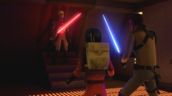 The big stunner is that after braving turbolifts and troopers and everything they can to get to who may be the last known living Jedi master, they quickly and easily find her cell. And she's there - but she's oddly quiet. It turns out she's a hologram. The reason that Kanan could sense her presence was that her dried-out corpse was in the cell, guarded by Stormtroopers not even authorized to see what was inside all these years. I now feel bad for insinuating that the Empire of this series were a bunch of chunky cream puffs - stealing fruit and farms is bush-league stuff, but capturing your enemy and entombing her remains to use as bait to capture or kill her friends? That's evil. I was more than a little shocked when the camera whips back to reveal none other than the nameless Inquisitor in his very first in-the-flesh appearance. Generally I don't get a case of the feels when watching Star Wars in any form, but I've always found the destruction of a heroic character in order to service the antagonists to be disturbing. The Borg used heroes as raw material for their conquests, Zombies often do as well. To see your hopes not only crushed, but to see that a comrade didn't get a proper burial is the kind of thing nobody should just bounce back from seeing.