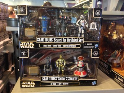 The second wave of Hasbro Star Tours exclusive action figure sets are here (retail $34.99 each). There are no changes in the packaging from the 2010 and 2011 sets and a few of the figures are re-issued or repainted and now only include 3 figures per set. The Search for the Rebel Spy set includes a repainted Signal Droid (now blue), a Seeker Droid, and an Imperial Sky Trooper (re-issued) while the Sector 2 Security Set has a G2 Droid, C-3PO (TSC re-issued), and an RX-Droid (repainted Captain Rex mold from 2002). The 2011 sets are still on shelves (and online) so you can easily pick up all 4 sets if you need them. Needless to say, you’ll have ample figures (if you also have the 2010 Boarding Party set) to make quite the appealing Star Tours diorama with that spectacular Starspeeder 1000 vehicle.