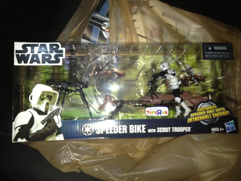 The ToysRUs exclusive Speeder Bike with Scout Trooper is out with sightings in Southern California and the Metro Phoenix area. The all new vehicle with loads of details and extras and an almost all new Scout Trooper figure retails for $21.99.