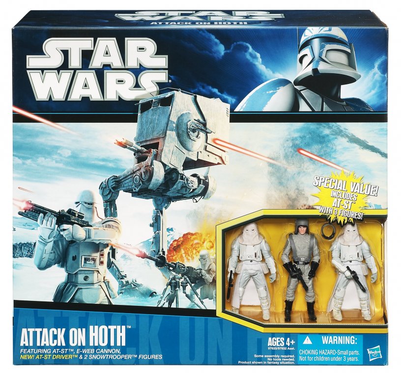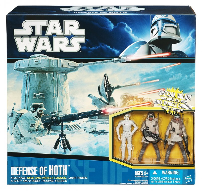 Stage a battle of epic proportions with these two STAR WARS HOTH BATTLE PACKS! With your ATTACK ON HOTH battle set, use the AT-ST™ vehicle (with AT-ST™ DRIVER) to stride across the grounds toward Echo Base. On the ground, two SNOWTROOPERS™ slam the Rebel base with laser fire from an E-Web heavy repeating blaster. Use your DEFENSE OF HOTH battle set to try to defend the base. K-3PO™ and two REBEL TROOPERS™ blast the enemy from the laser towers that ring the base, and fire anti-vehicle cannons and medium repeating blasters at the SNOWTROOPERS and AT-ST walkers. With all of this firepower, there’s no telling who will win this fight!