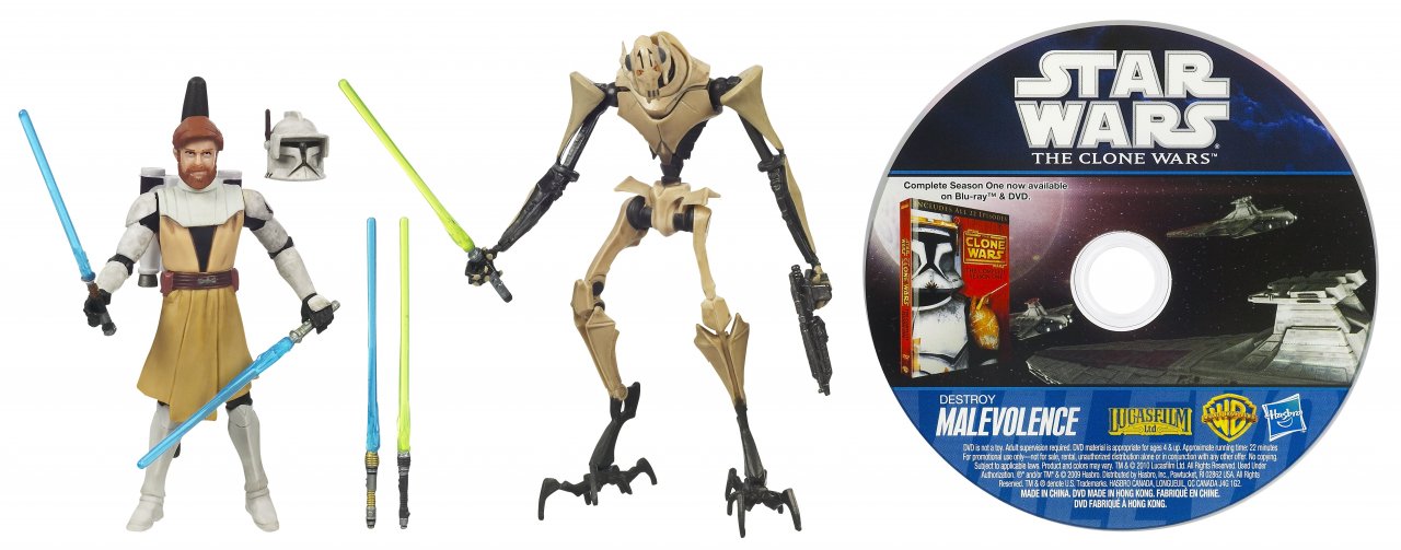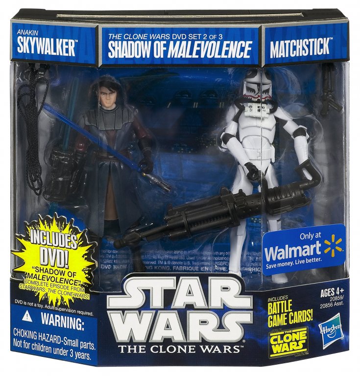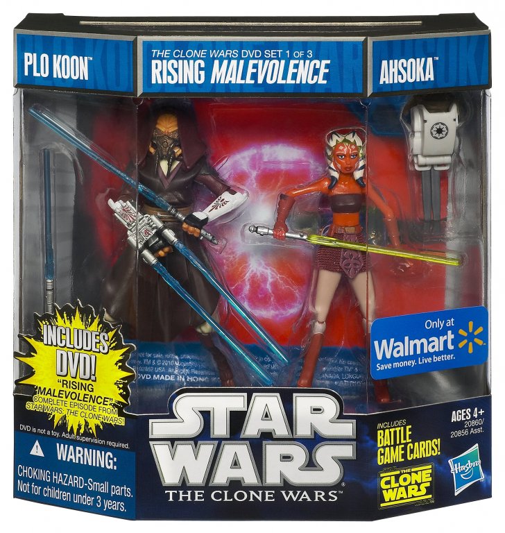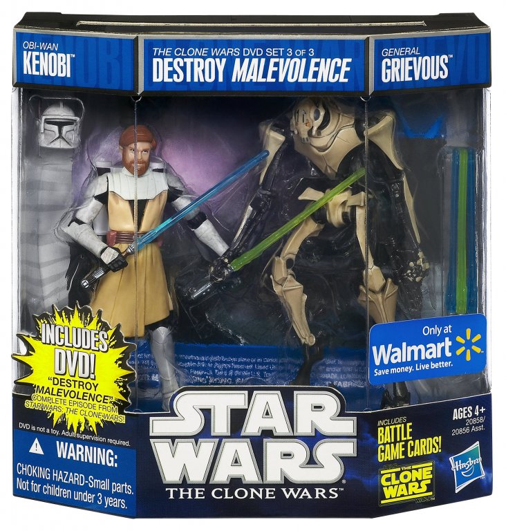 Collect all three of the STAR WARS: THE CLONE WARS DVD and two figure packs. The RISING MALEVOLENCE set includes AHSOKA™ and PLO KLOON™ figures, the SHADOW OF MALEVOLENCE set includes ANAKIN SKYWALKER™ and MATCHSTICK figures, and the DESTROY MALEVOLENCE set includes OBI-WAN KENOBI™ and GENERAL GRIEVOUS™ figures. Each set also includes a DVD and CLONE WARS GALACTIC BATTLE GAME™ cards. Each set sold separately.