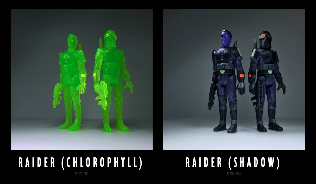 f you like 3 3/4-inch action figures, the indie world has been a great place to dwell. Healey Made's Raider is now available in clear green and black, the latter of which has since sold out. They're $20 and $25, respectively. Legend has it an old Kenner sculptor worked on these, so you may want to keep your ears to the ground for announcements of future painted figure releases. An unpainted blue prototype seems to be long gone - I didn't even see it get listed!
