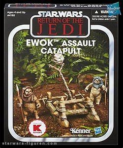 Ja, das haben die Ewoks so gerne! Starwars-Figuren.com has shots of the Kmart-exclusive Ewok Assault Catapult set that was alluded to back at Toy Fair but not seen until, well, now. It has 2 new Ewok figures in a vintage-style box with a catapult accessory and appears to be official Hasbro photography. Click here to see shots both in and out of the box!