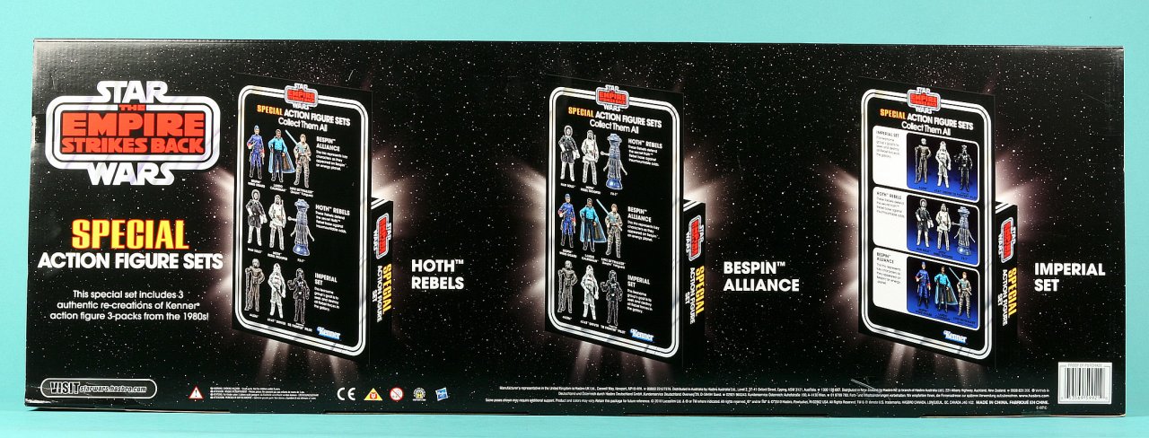 The Vintage Kenner Star Wars 3-Packs are some of the most rare and difficult action toy collectibles to track down, let alone compile a complete set. To commemorate Empire's 30th anniversary, Hasbro teams up with Target to produce 3 packs within a 3 pack and reproduces the classic Kenner packaging that sends wings aflutter for many who love the nostalgia and design of the black and silver piping as well as that Kenner logo.