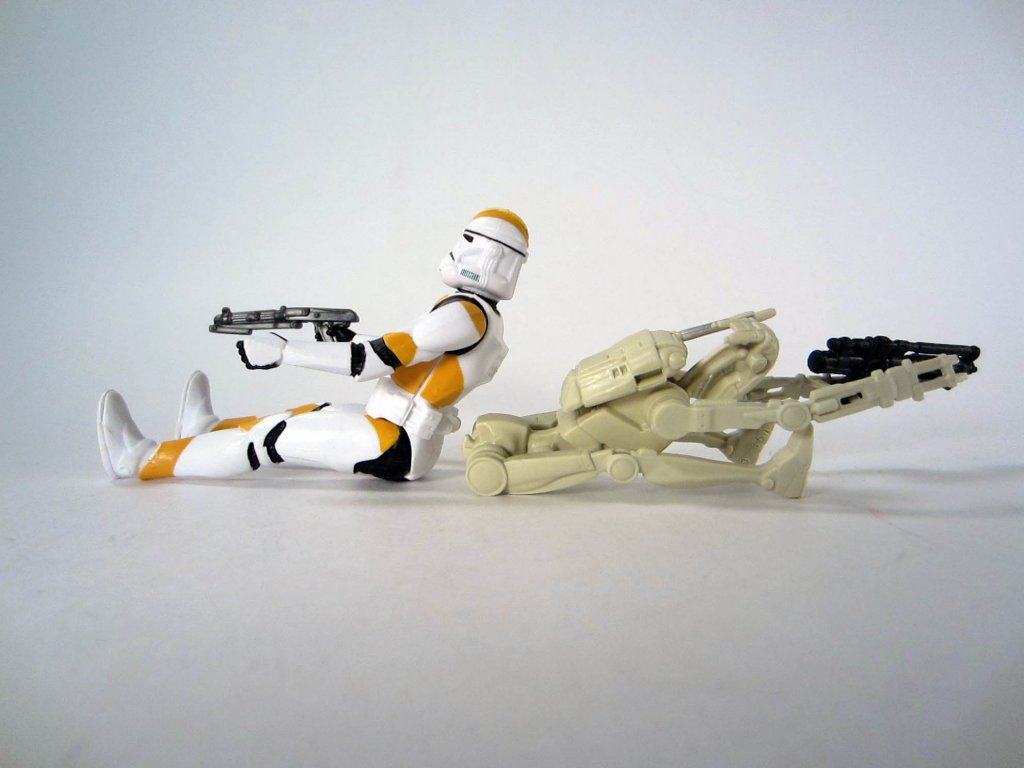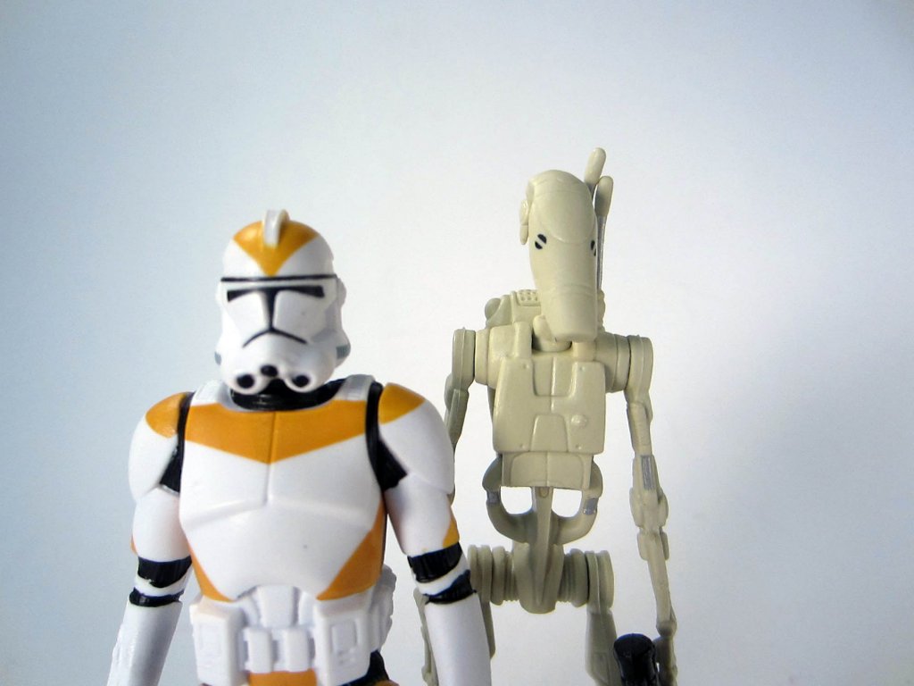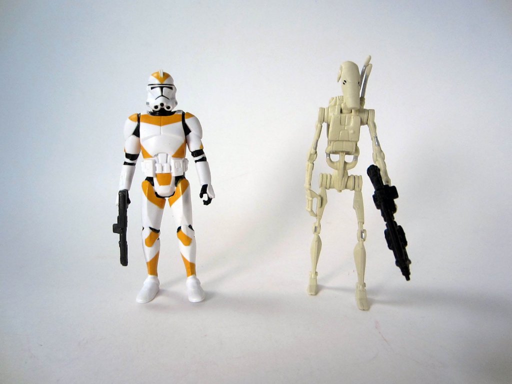Verdict: Buy something else. The Clone Trooper is a repaint and the Battle Droid is a re-re-repaint of a mold originally sold back in 2002, and it is at the end of its rope. For army builders, customizers, and completeists only. Others will be faced with the bully that used to take their lunch money being replaced by Hasbro taking their lunch money.