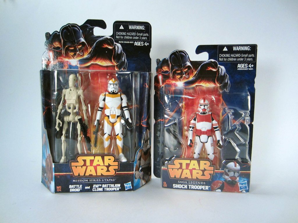 Each figure is a new sculpt in this line, but not the Battle Droid. The Clone Trooper is the same body used on the Saga Legends 2013 Clone Trooper (AOTC) as well as the Shock Trooper and Utapau Clone Trooper. The Battle Droid is available with Jango Fett with a different paint job, but all of the new sculpts debuted in July 2013 together in these new waves.