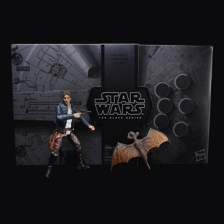 Sometimes we get exclusive figures, sometimes we get sneak peeks with exclusive gear. The STAR WARS: THE BLACK SERIES HAN SOLO AND MYNOCK figures are a surprisingly fair $34.99 in a big fancy box that recalls the awesome Boba Fett from 2013. Han has a breathing mask, Mynock, and some other goodies. The box reads "Exogorth Escape," and if that seems baffling that's because you missed the Knights of the Old Republic comic books that gave a name and backstory to the big space slugs. Mystery is dead, but the hunt lives on - more pictures and press info after the break.
