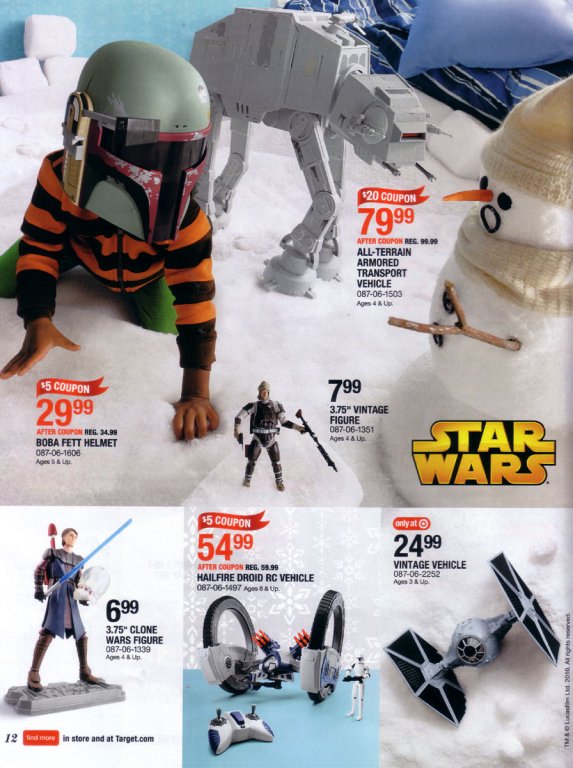 The Target Great Holiday Toy Sale mailer has hit mailboxes this week and features a few Star Wars deals including a $20 off coupon for the AT-AT. $5 Off coupons are also available for the Boba Fett helmet and RC Hailfire Droid. If you prefer to shop online at Target.com, the coupon code for the AT-AT is TCHD1034. Sale ends November 24th.
