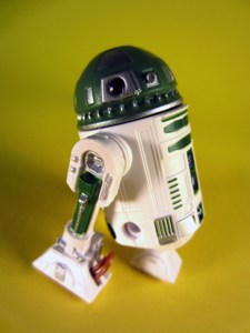 The Green R9 Series Astromech Droid is one of those pesky "new" figures in the Star Tours droid part bins. If you want an R9, you gotta go to Orlando. Some colors look better than others, and the green ain't bad.