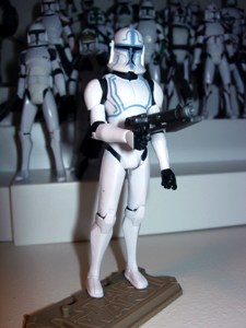 This is a good one! Another Battle Pack exclusive, Clone Trooper Echo (Kamino) has some awesome deco. There's a swell tampo on his thigh, slick blue stripes, and of course, a gun. You need guns.