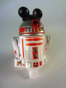The Silver and Red Droid Factory R2-Series Astromech Droid is very much like R2-M5, but it's a little bit more orange and has a hole in his head for the purposes of hats. This is a good reason to buy a figure. Hats = better. This one is shown in Mickey Mouse ears, but... geez, if that isn't an apt metaphor for the last few weeks I don't know what is.