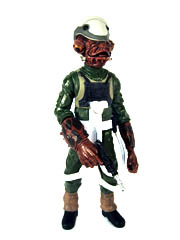 We finally have the Cracken released, and he's a mix of old and new. The head and top torso are new while the bottom legs are from 2006's Rebel Trooper (SAGA046). The actual figure doesn't look anything like the guy on the cardback, who actually bears a close resemblance to one of the kiosk folks at my local mall, stubble and all.