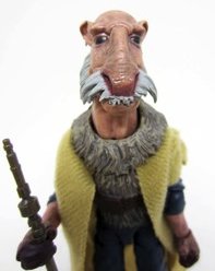 It was nearly a year ago Hasbro teased us with the first glimpse of Yak Face at New York Toy Fair. The next Toy Fair is days away, and Saelt-Marae (whatever) is here now! It's pretty good - the coloring and weapon matches up nicely to the vintage original figure, but it include the coat and a more accurate head. You want this one - and maybe you're getting one with your Sail Barge. Read on!