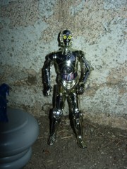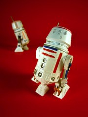 Given the nebulous nature of what constitutes an actual full figure, the Red R9-Series Astromech Droid is more than a little arbitrary. We'll be viewing the Star Tours Droid Factory figures as unique characters, defined by the dome. (The body is, of course, up to you.) This one is bright red, almost orange, with a rich silver texture and a softer sculpt than his brothers. Is it worth the trip and obscene price on eBay?