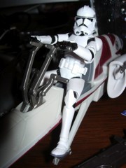 This is the new Clone Trooper packaged with a BARC Speeder which you can buy pretty much anywhere. Basically, it mixes up existing figures and gives you a ton of guns! How is it? Read on!