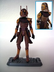 So, Clone Commander Jet. I know what you want to read is commentary on Toy Fair, but, as a member of the toy industry, I'm in meetings and trying to figure out how to cram a pile of paperwork into a carry-on bag with my dirty socks. I'll try to write something on the plane or as soon as I can get sme decent time to collect my notes. This trooper was delayed, and features a unique accessory.