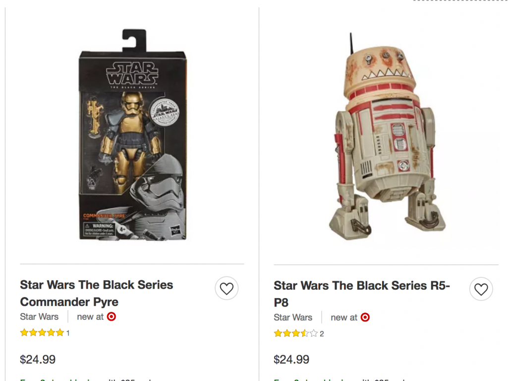 If you missed pre-orders a few days ago (or wanted to save on shipping) today is your lucky day! Target.com added in-store pick-up Star Wars: The Black Series Commander Pyre and R5-P8 action figures from its Star Wars: Galaxy's Edge collection. Click here for availability, they're currently $24.99 a piece.
