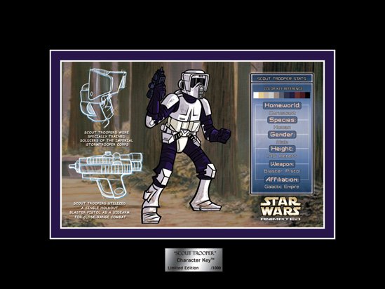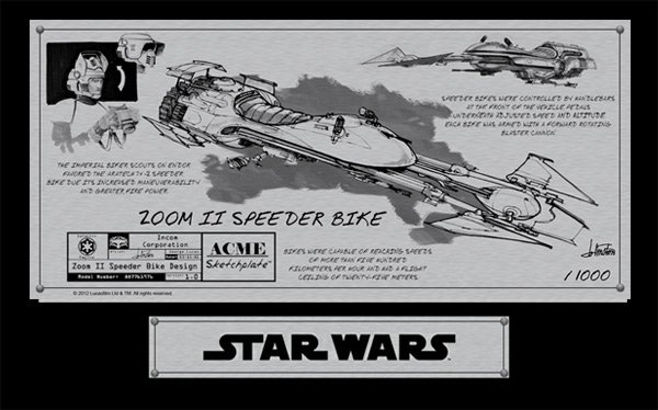 Acme Archives announces their exclusive for Comic-Con International and Celebration VI to be a Scout Trooper Character Key in animated style. That key has a run of 1000 pieces and is priced at $39.00 each. Following in the same theme, Acme will also offer a non-exclusive Speederbike Sketchplate at Comic-Con.