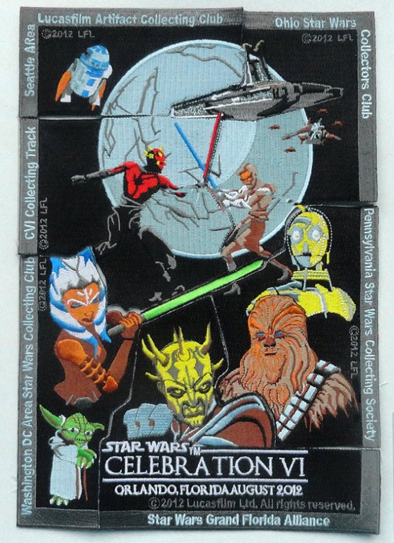 Five Star Wars collecting clubs along with the Celebration VI Collecting Track will mark Celebration VI by giving away sections of an exclusive 6-piece patch set. When assembled, the pieces form a Clone Wars themed movie poster. The poster features characters from all six movies of the Star Wars saga along with characters from The Clone Wars TV series. The clubs participating in this project are the Washington DC Area Star Wars Collecting Club (DCSWCC), the Ohio Star Wars Collectors Club (OSWCC), the Pennsylvania Star Wars Collecting Society (PSWCS), the Star Wars Grand Florida Alliance (SWGFA), the Seattle ARea Lucasfilm Artifact Collectors Club (SARLACC) and the Celebration VI Collecting Track.