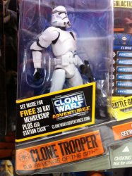 Sony teams up with Hasbro to promote their Clone Wars Adventures online game. Basic The Clone Wars and Saga Legends action figure blisters are being affixed with stickers touting a 30 day trial membership and 450 Station Cash. These stickers are showing up at Toys R Us stores this week.